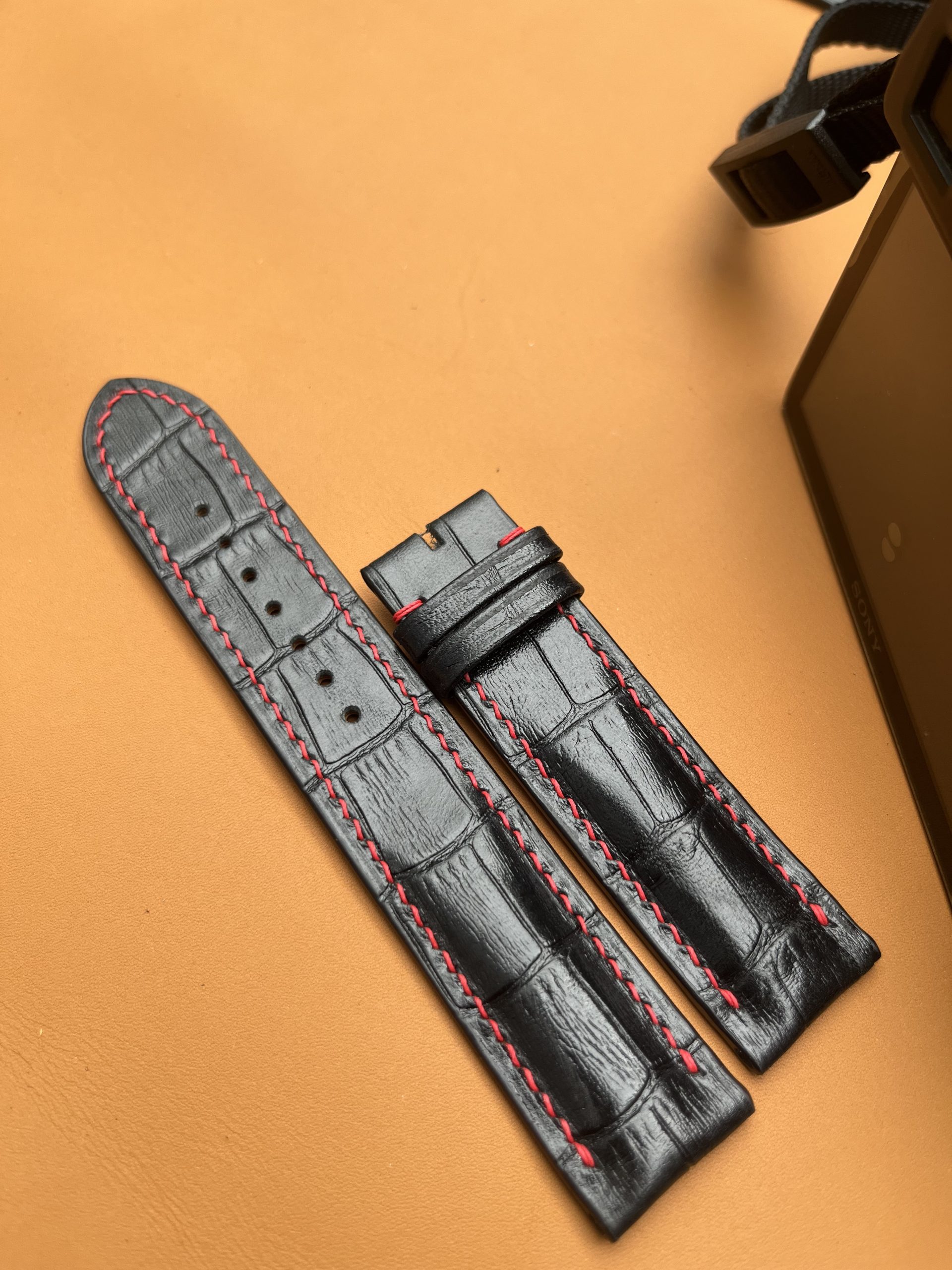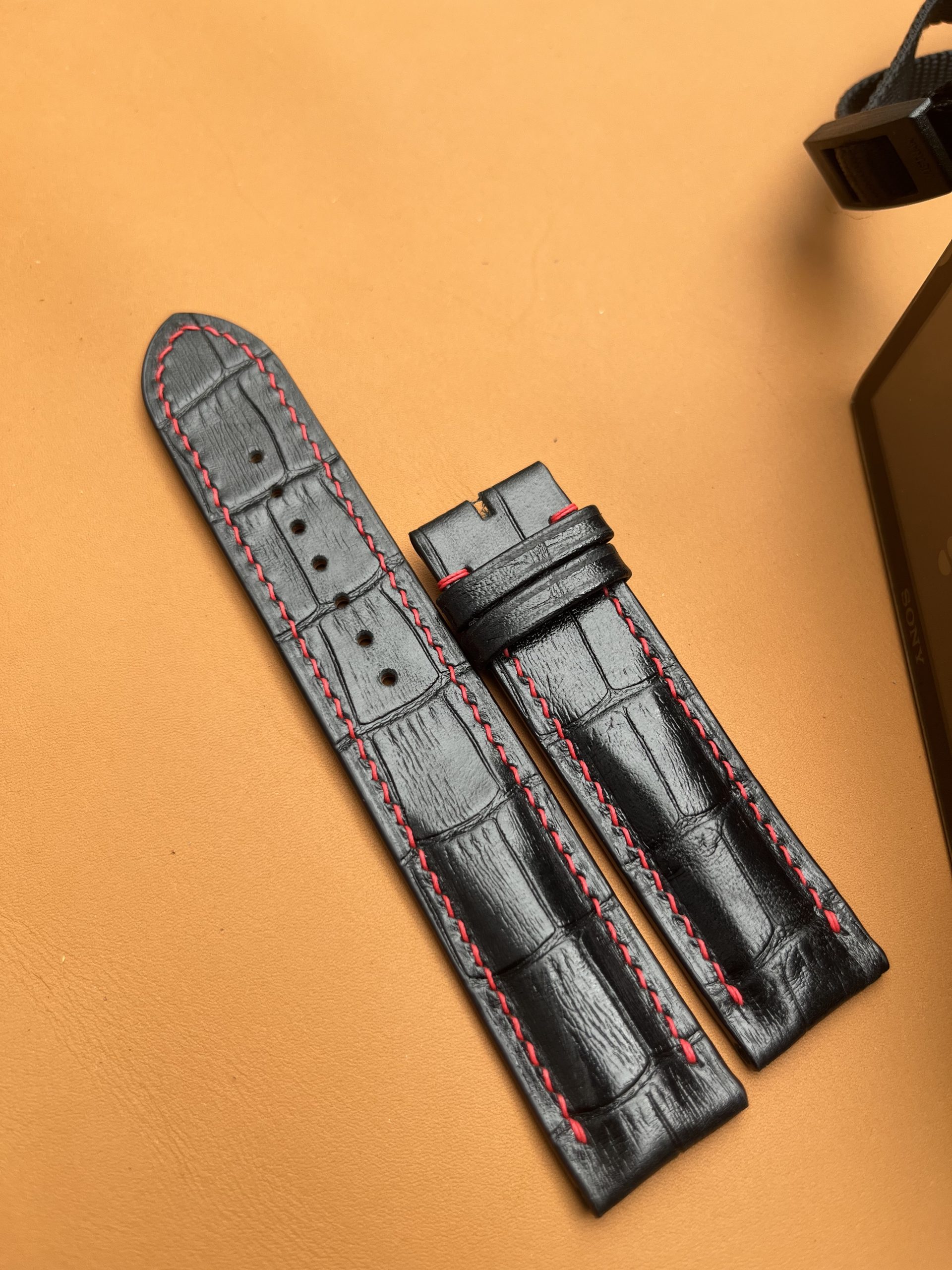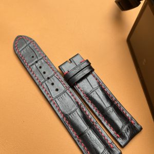 Dây đồng hồ Handmade da bò dập vân cá sấu màu đen, khâu chỉ đỏ ,DBCS001