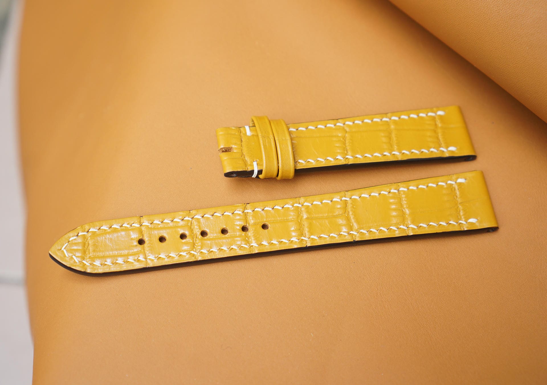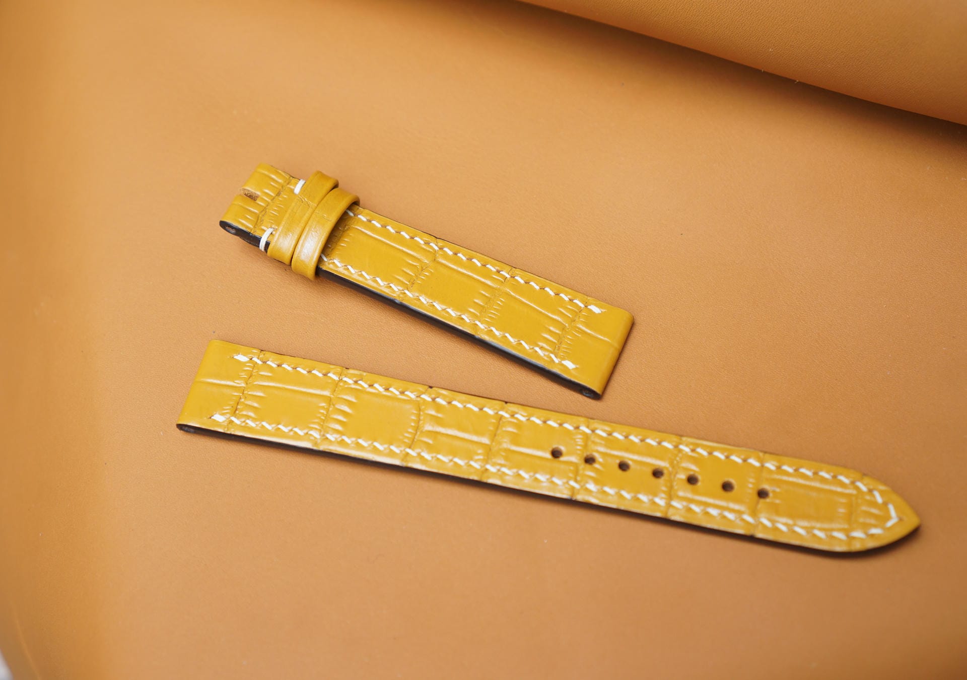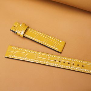 Hãy là người đầu tiên nhận xét “Dây đồng hồ Handmade da bò dập vân cá sấu màu vàng DBCS010”