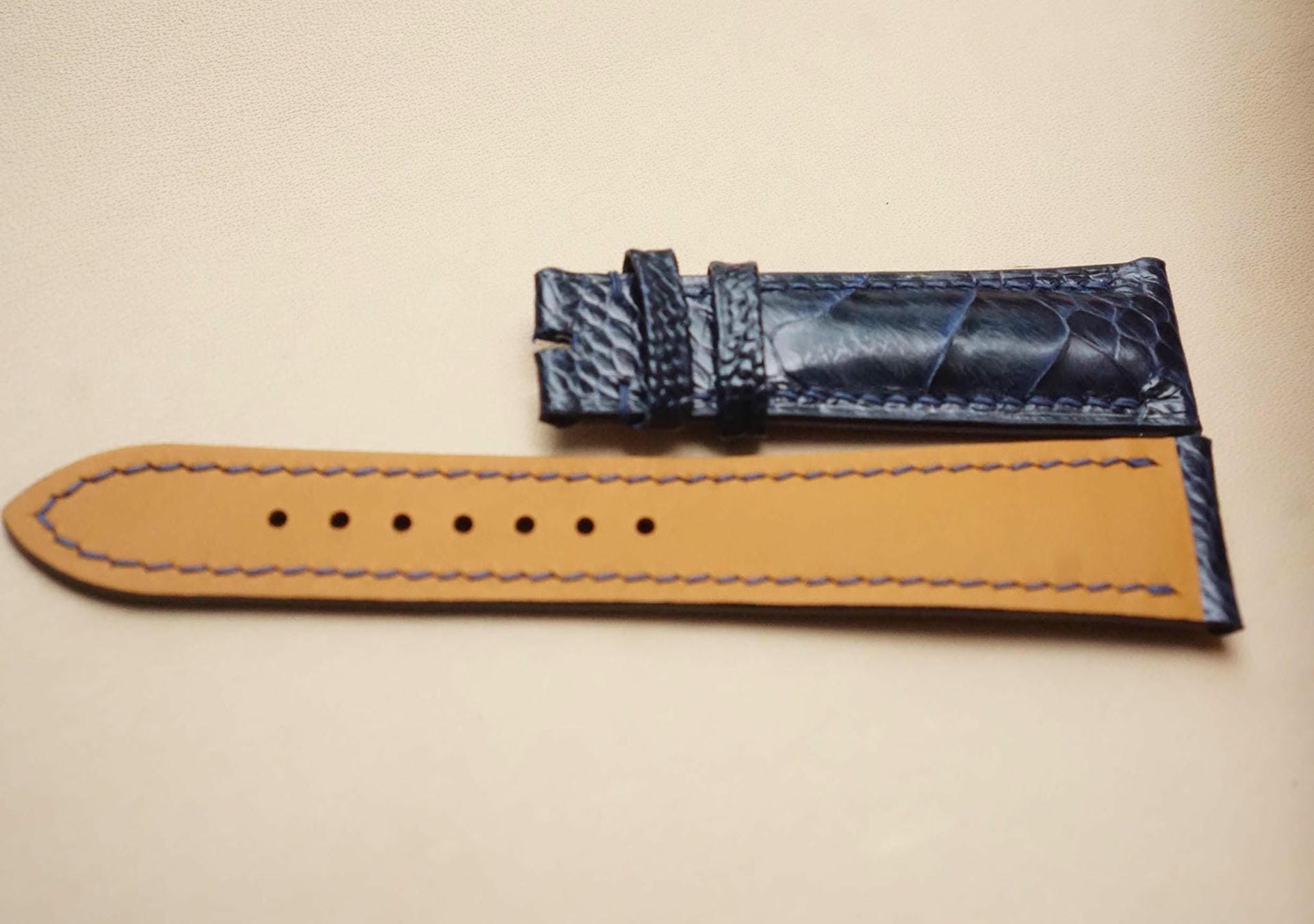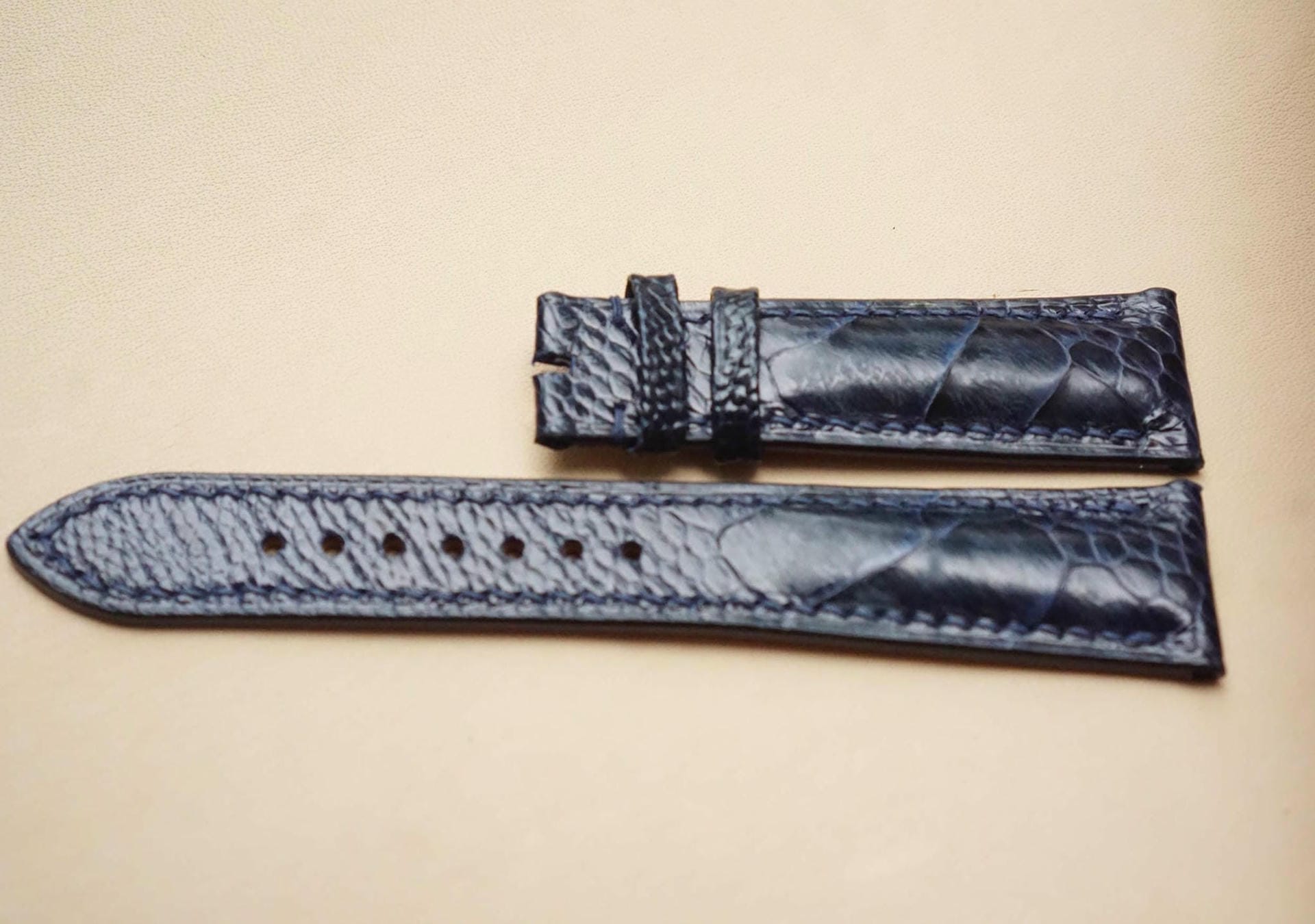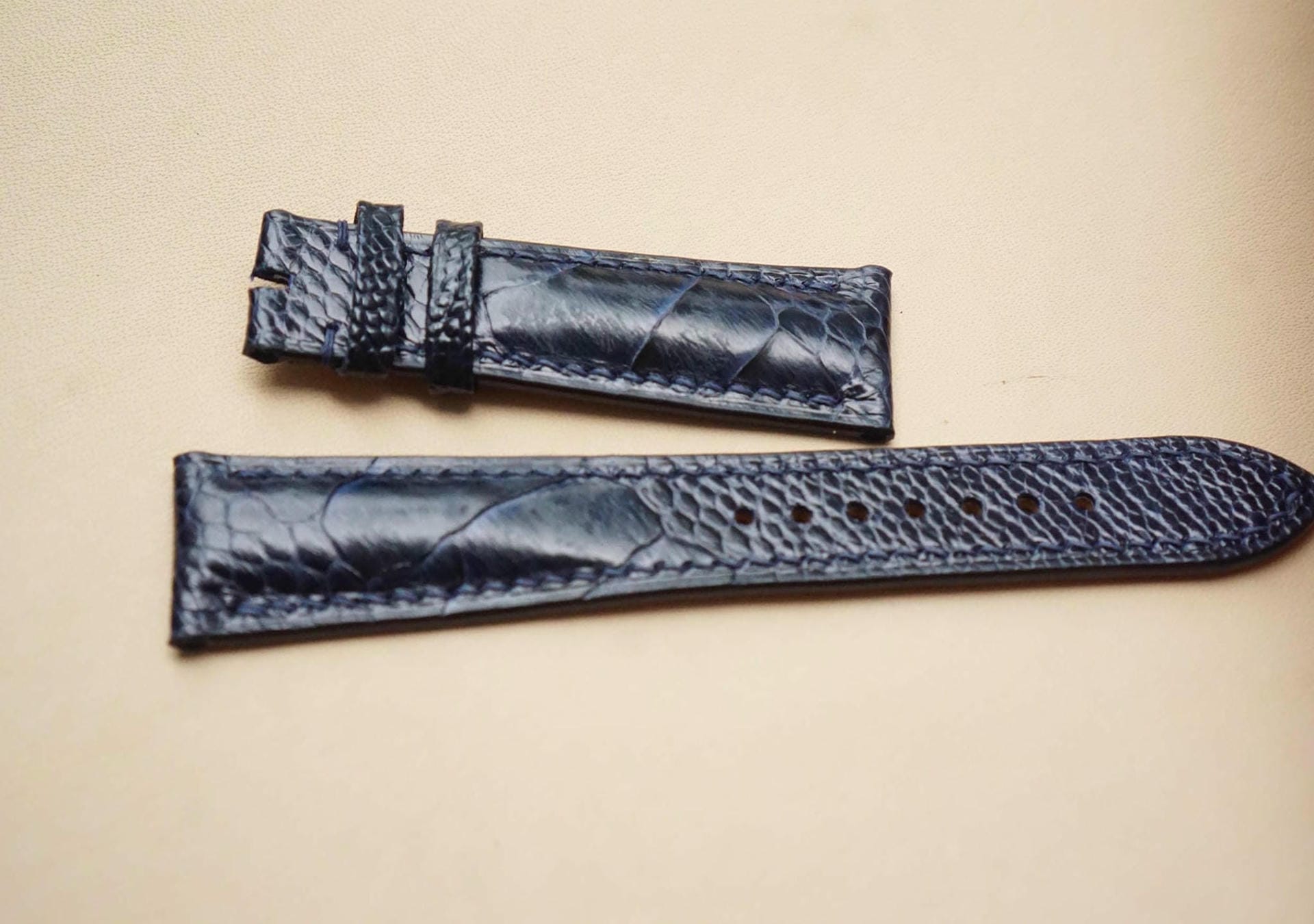 Hãy là người đầu tiên nhận xét “Dây đồng hồ Handmade da đà điểu Khatoco vảy chéo màu NAVY đậm , khâu chỉ cùng màu DH665”